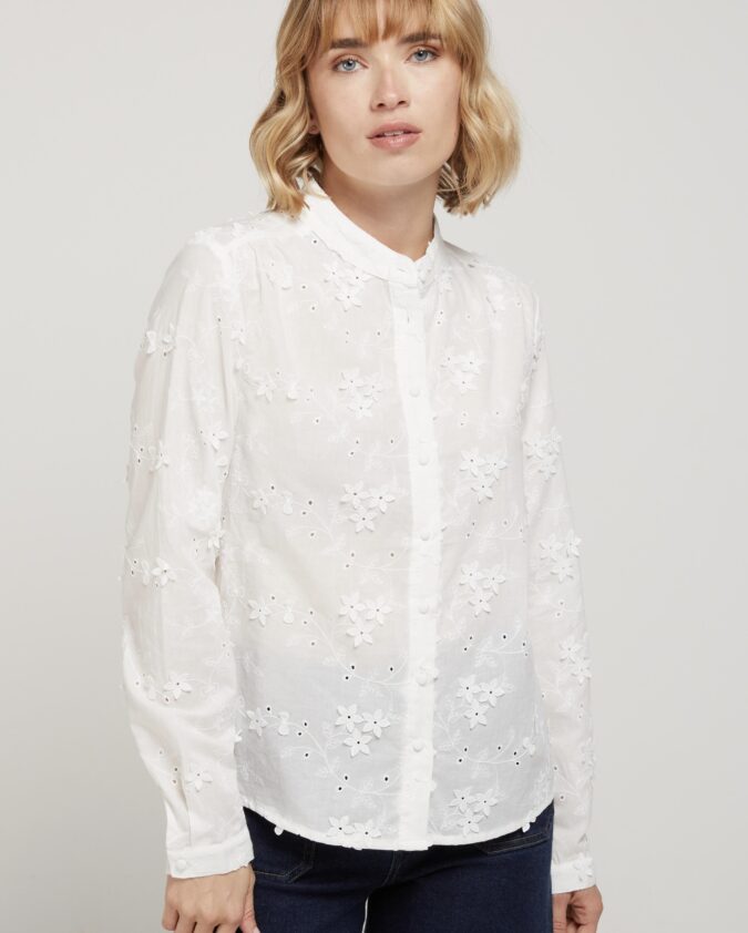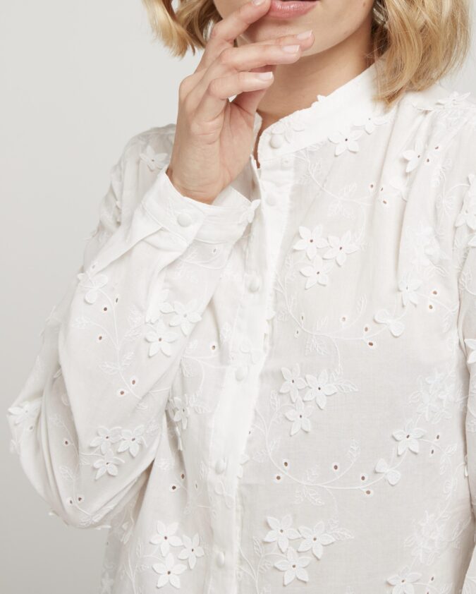 Λευκό πουκάμισο με ανάγλυφα λουλούδια και κεντητές λεπτομέρειες.