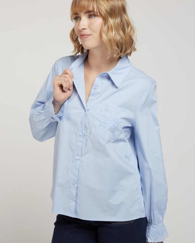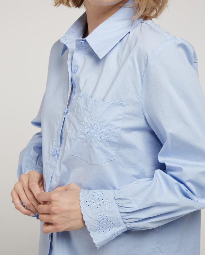 Γαλάζιο πουκάμισο με κεντήματα στις μανσέτες και την τσέπη.