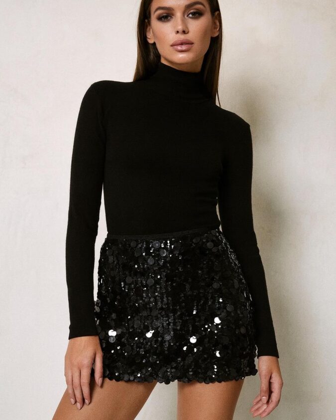 5% Elastane - 45% Polyester - 50% Viscose. Mini φούστα καλυμμένη με μαύρες παγιέτες.