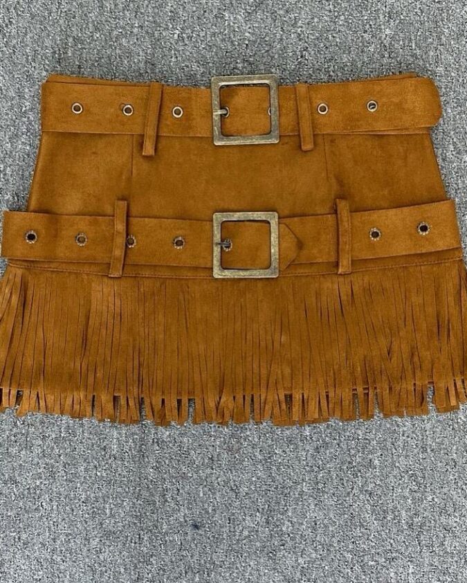 Mini φούστα από suede ύφασμα με κρόσσια και αγκράφες.