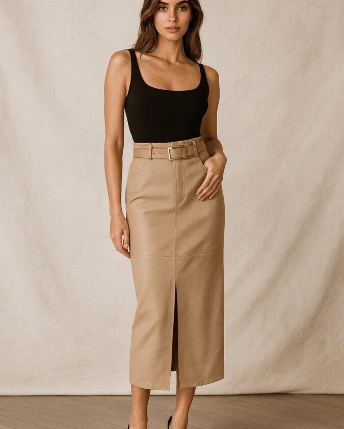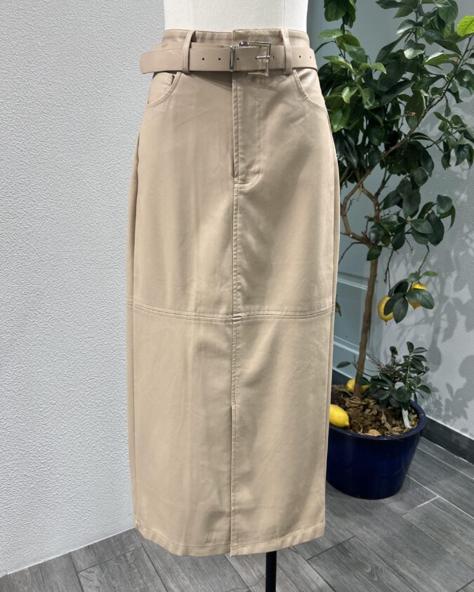 Midi φούστα σε μπεζ χρώμα με αποσπώμενη ζώνη και ψηλόμεση εφαρμογή.