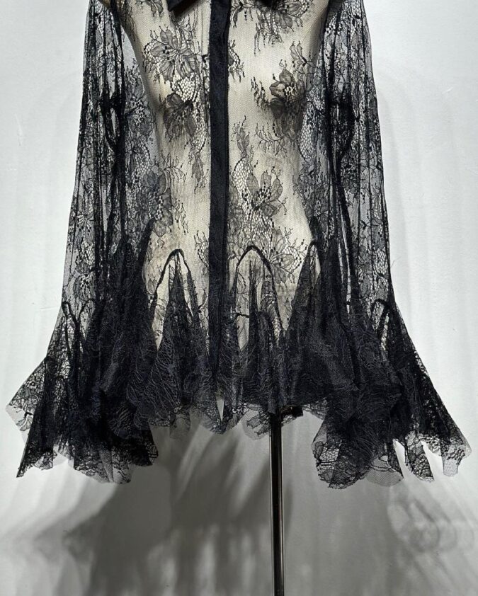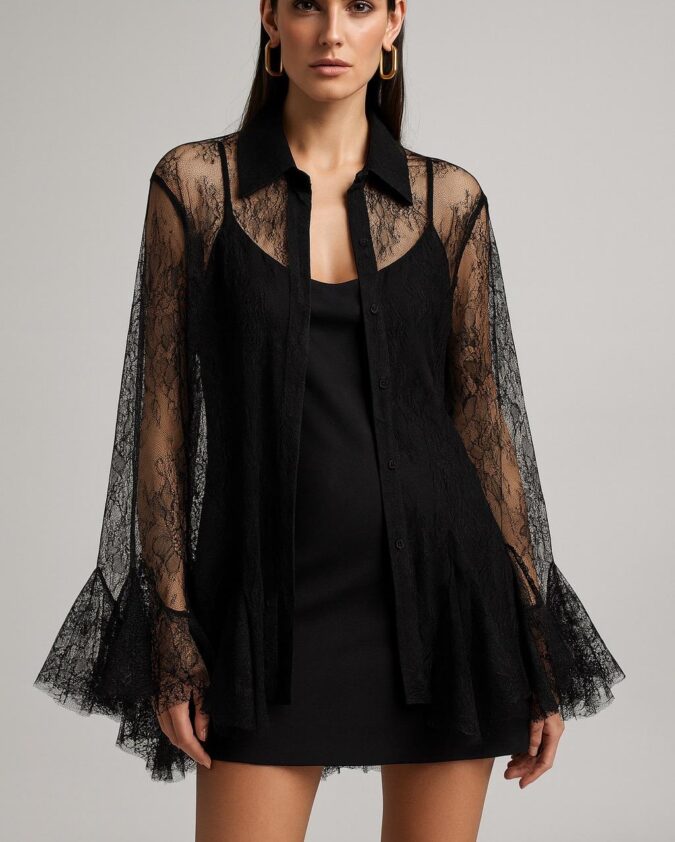 50% Cotton - 50% polyester. Μαύρο διάφανο πουκάμισο από δαντέλα με καμπάνα μανίκια.