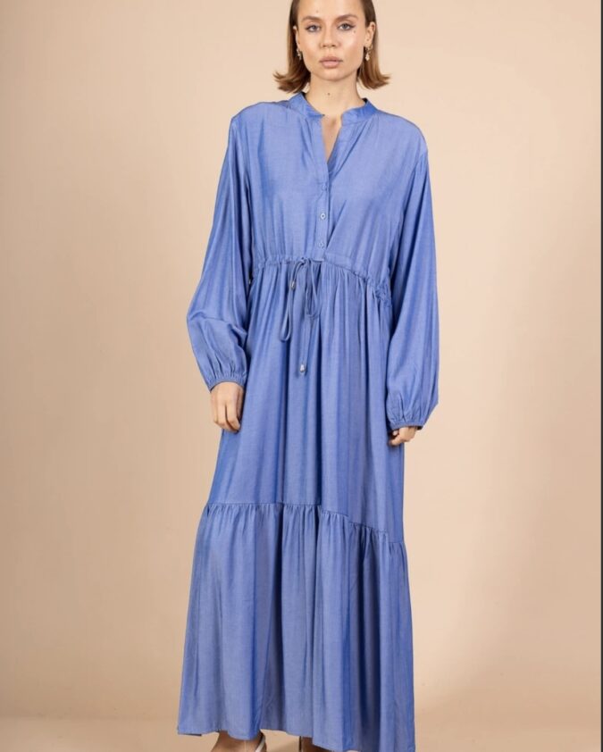 Jean midi φόρεμα σε σκούρο μπλε denim. Κλείσιμο με κουμπιά, ζώνη με αγκράφα και εφαρμοστή γραμμή που αναδεικνύει τη σιλουέτα.Σύνθεση: 2% Elastane - 23% Polyester - 75% Cotton.