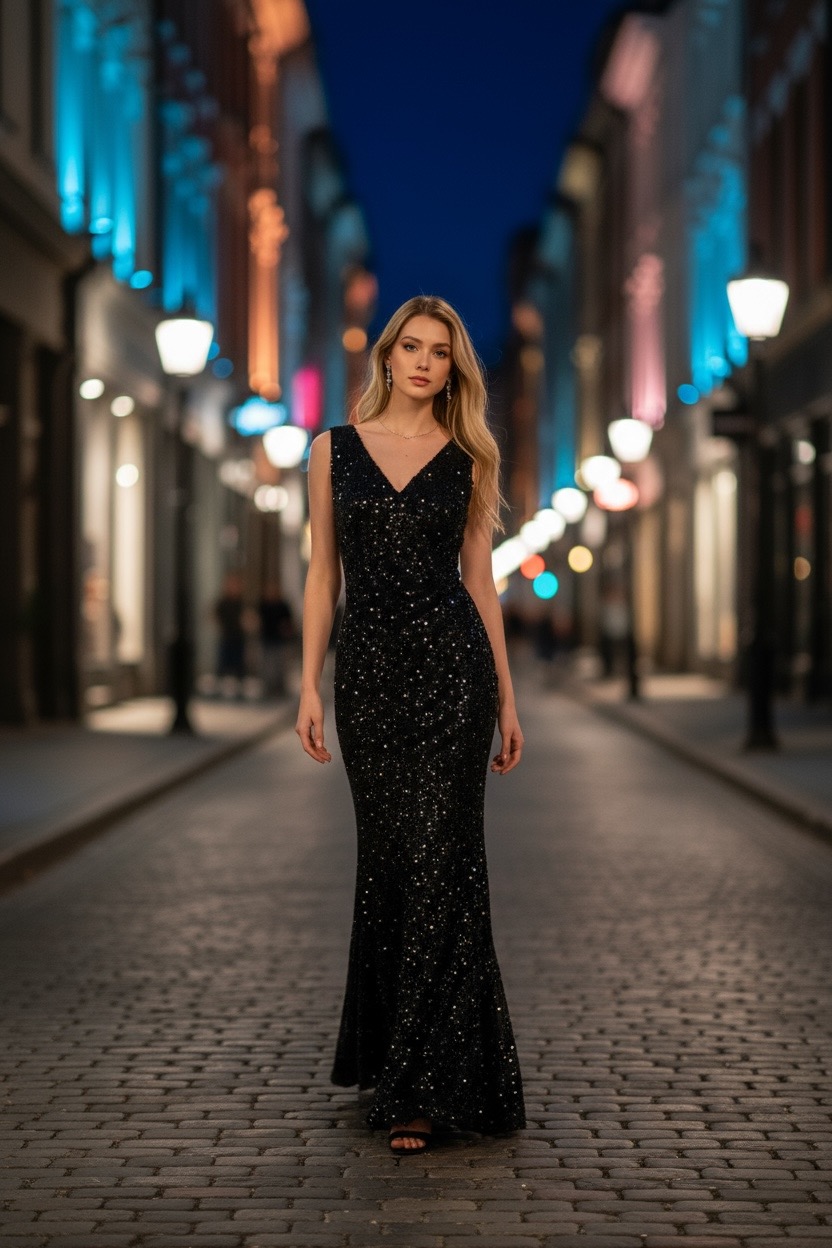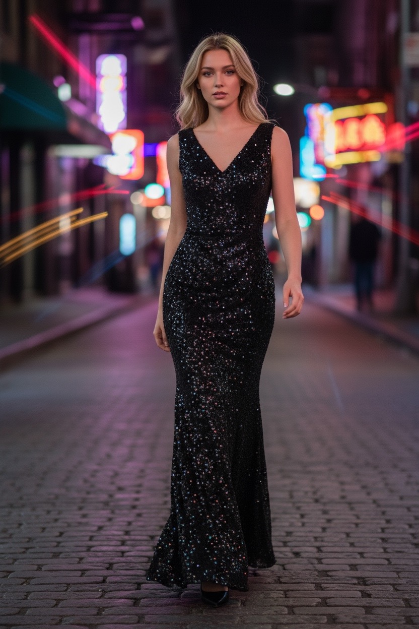 Κάντε μια statement εμφάνιση με αυτό το maxi φόρεμα με παγιέτες σε βαθύ μαύρο χρώμα.