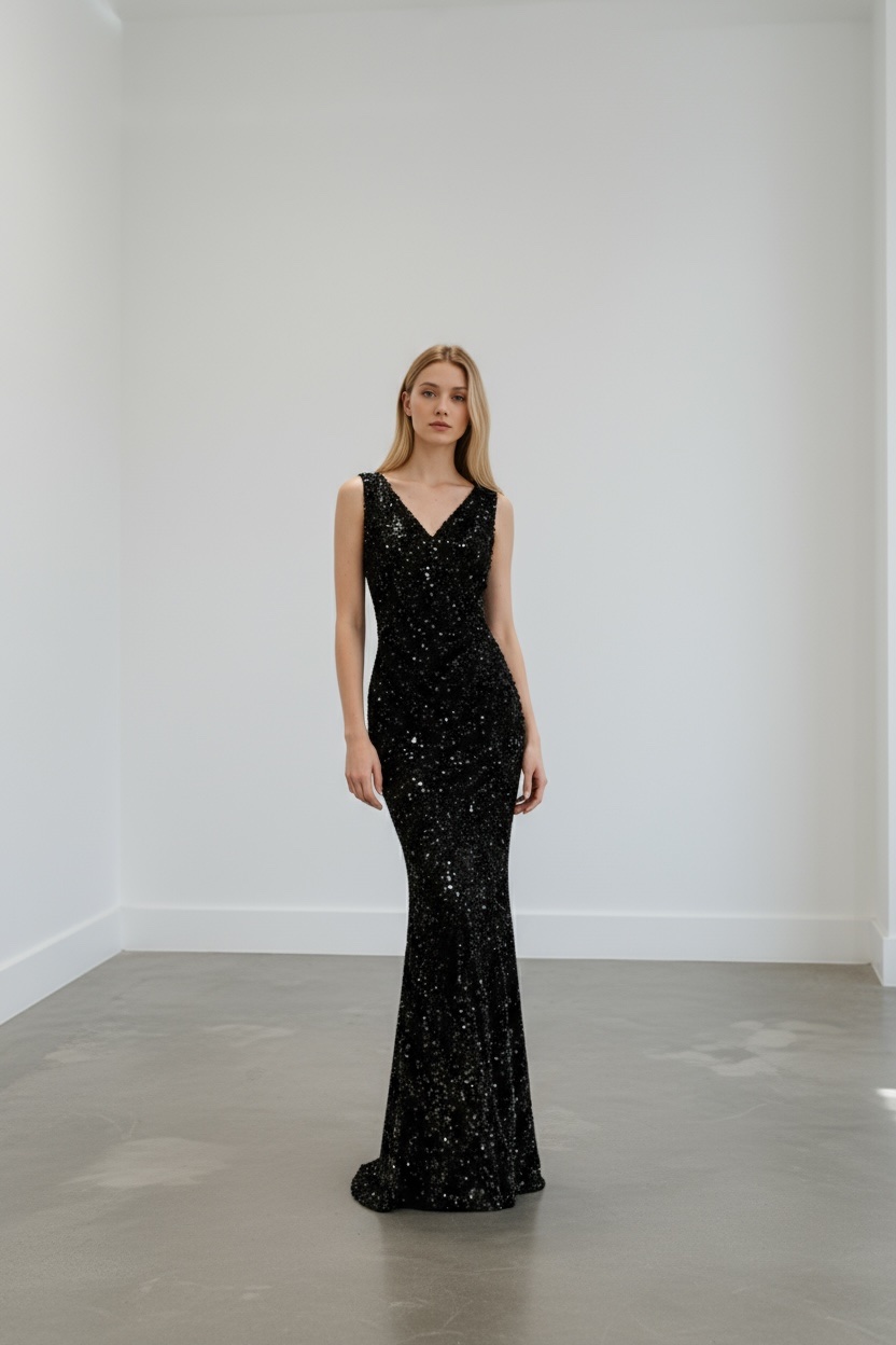 Το V ντεκολτέ και η draped εφαρμογή στη μέση αναδεικνύουν τη σιλουέτα, ενώ το ολόσωμο sequin ύφασμα χαρίζει αξεπέραστη λάμψη σε κάθε κίνηση.