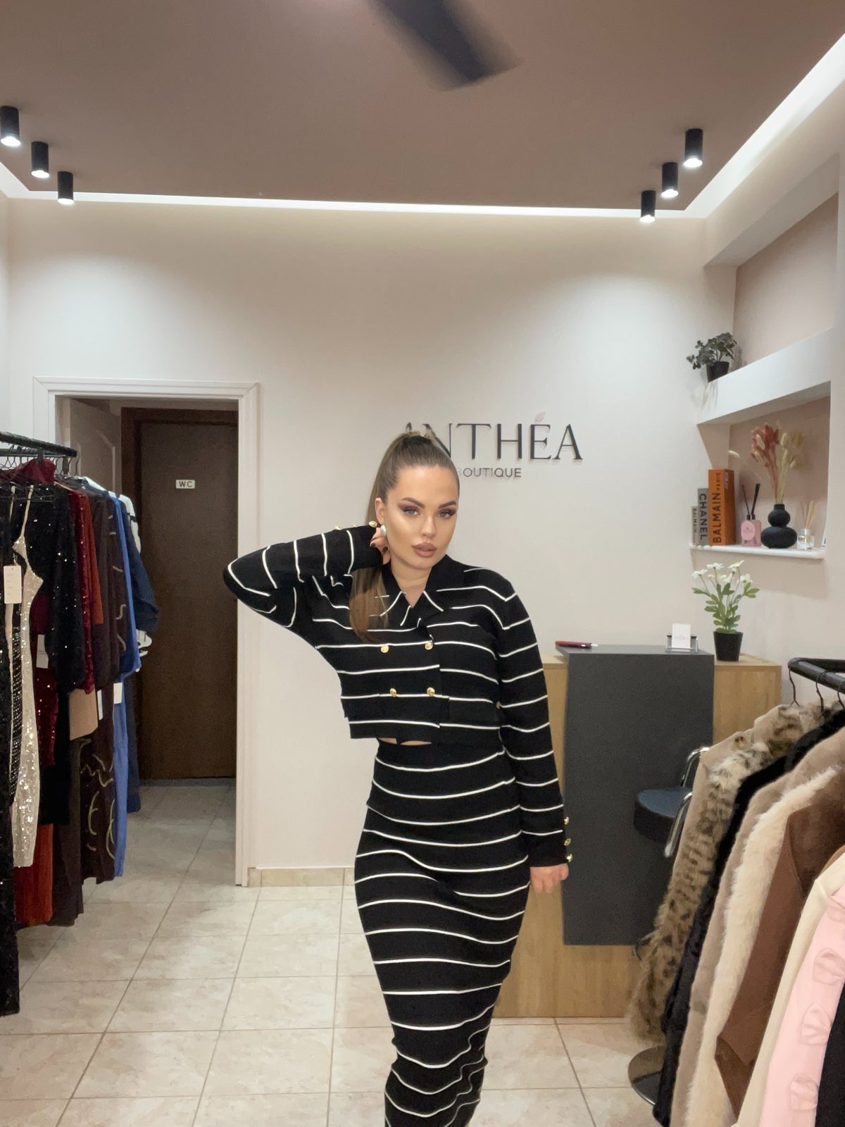 Το ασπρόμαυρο ριγέ σετ συνδυάζει την κομψότητα του κλασικού με τη φρεσκάδα του μοντέρνου.