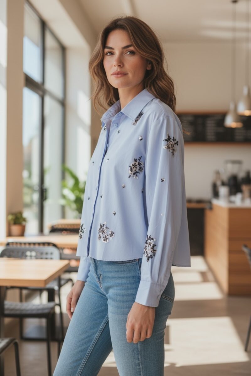 Αναδείξτε το στυλ σας με αυτό το γαλάζιο πουκάμισο, διακοσμημένο με παγιέτες και απλικέ λεπτομέρειες σε floral σχέδια.