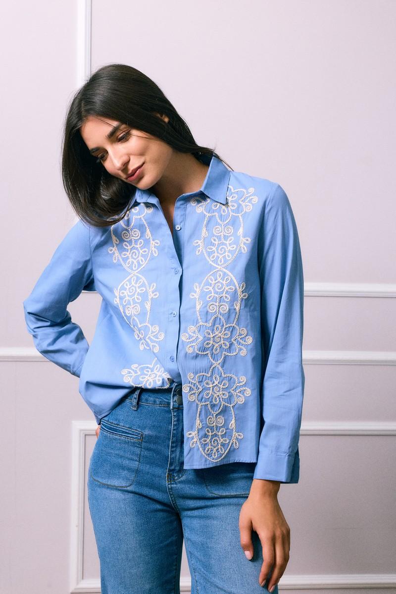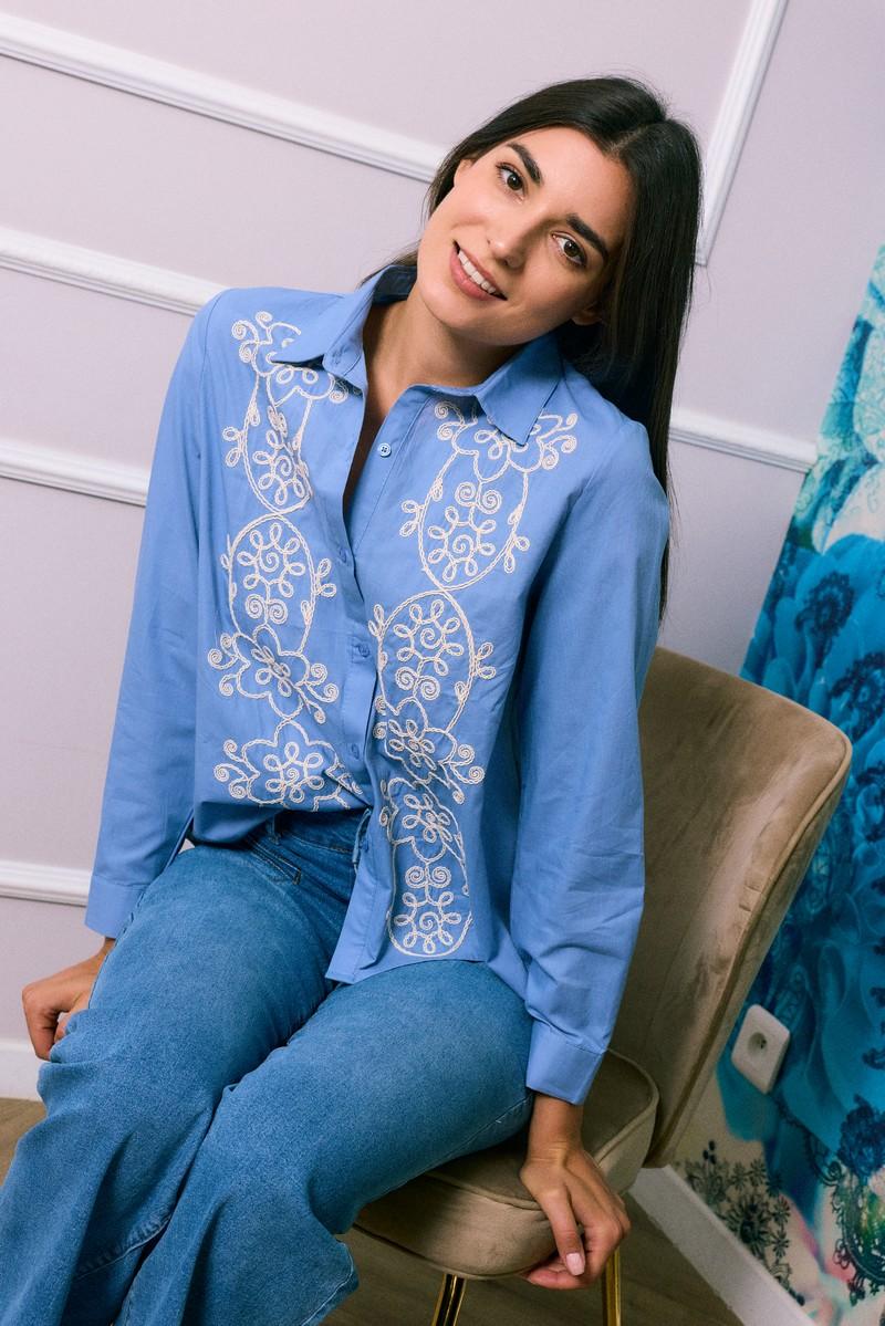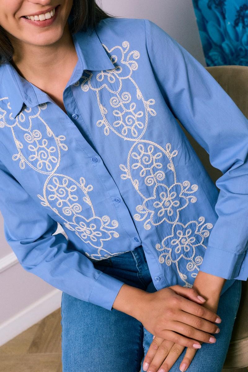 Αναδείξτε το στυλ σας με αυτό το γαλάζιο πουκάμισο που ξεχωρίζει χάρη στα λευκά κεντήματα σε λουλουδένια μοτίβα.