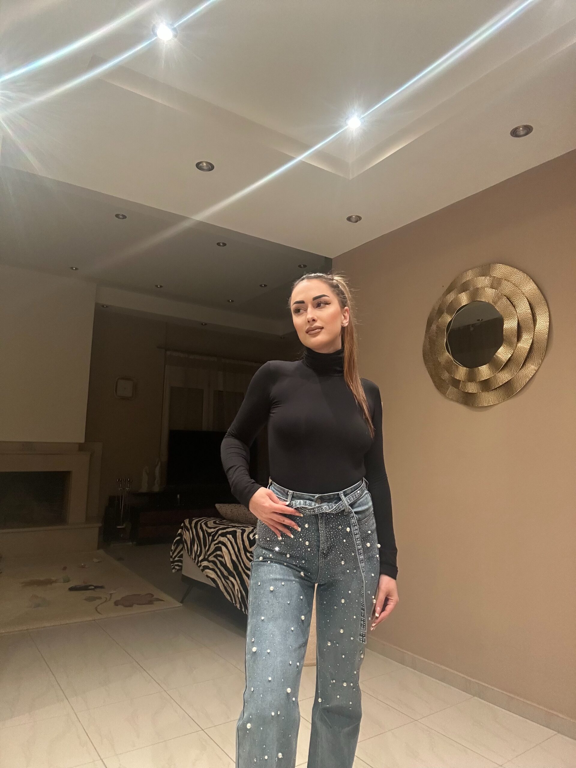 Λεπτομέρειες προϊόντος: Ίσια γραμμή (straight fit) Ψηλόμεση εφαρμογή Διακοσμητικές πέρλες σε όλη την επιφάνεια
