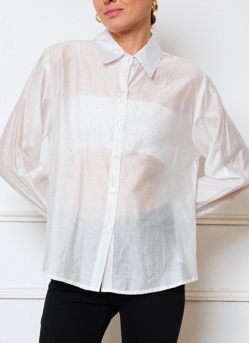Λευκό διάφανο πουκάμισο με διακριτικές στρας λεπτομέρειες.
