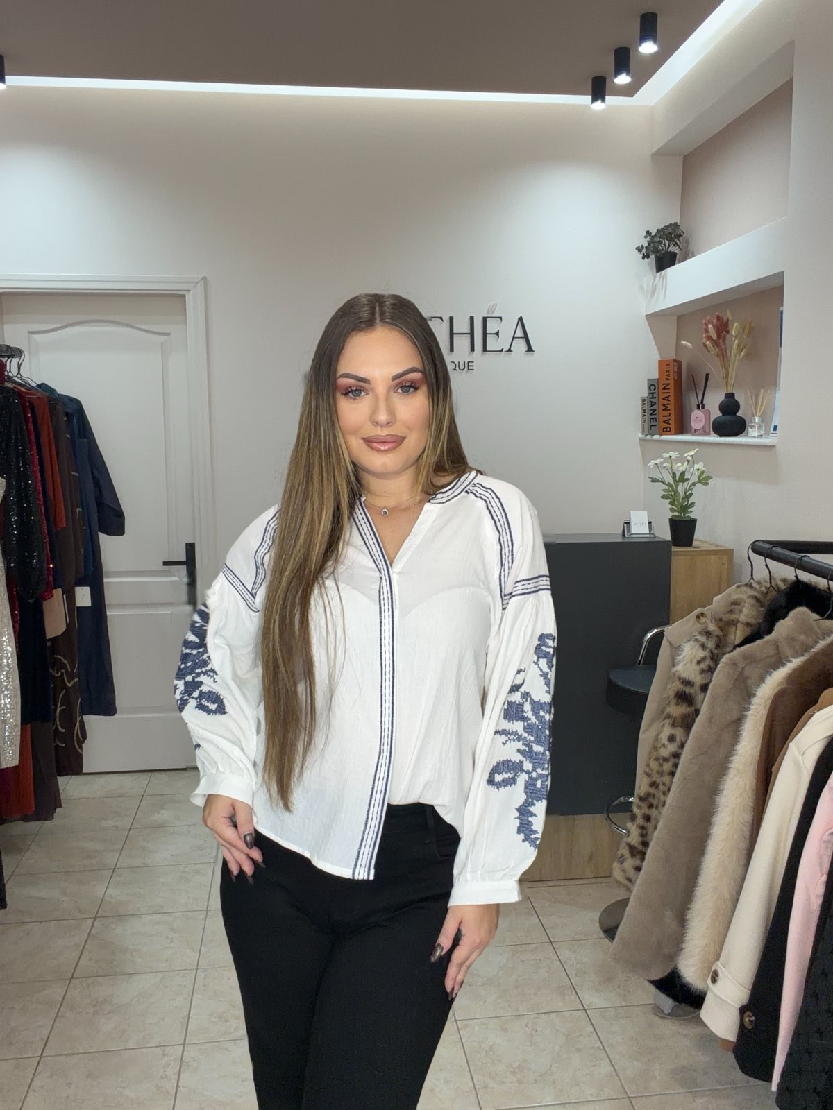 Φέρε μια πινελιά από καλοκαιρινή κομψότητα με αυτό το λευκό πουκάμισο με μπλε κεντήματα, εμπνευσμένο από παραδοσιακά μοτίβα.