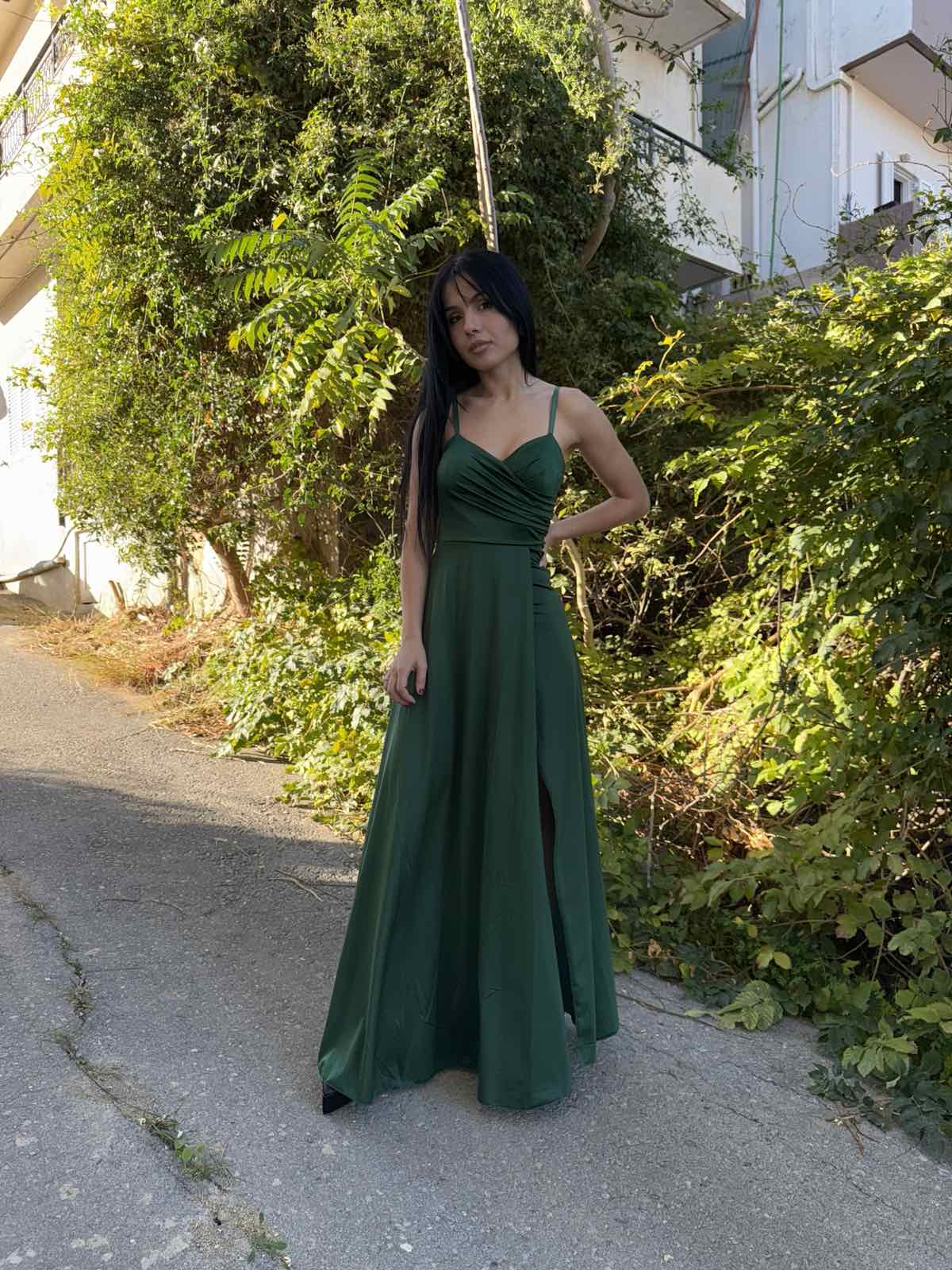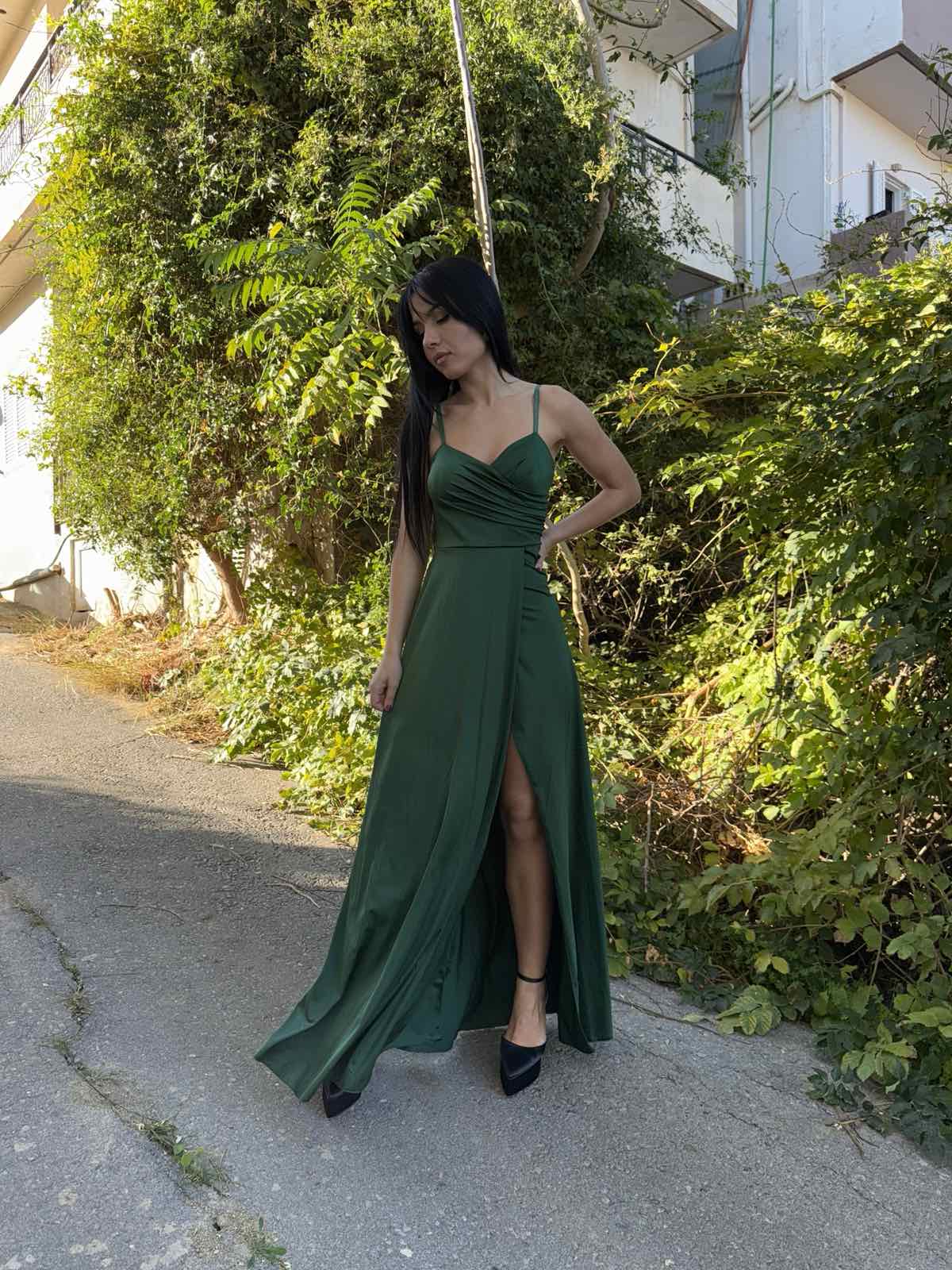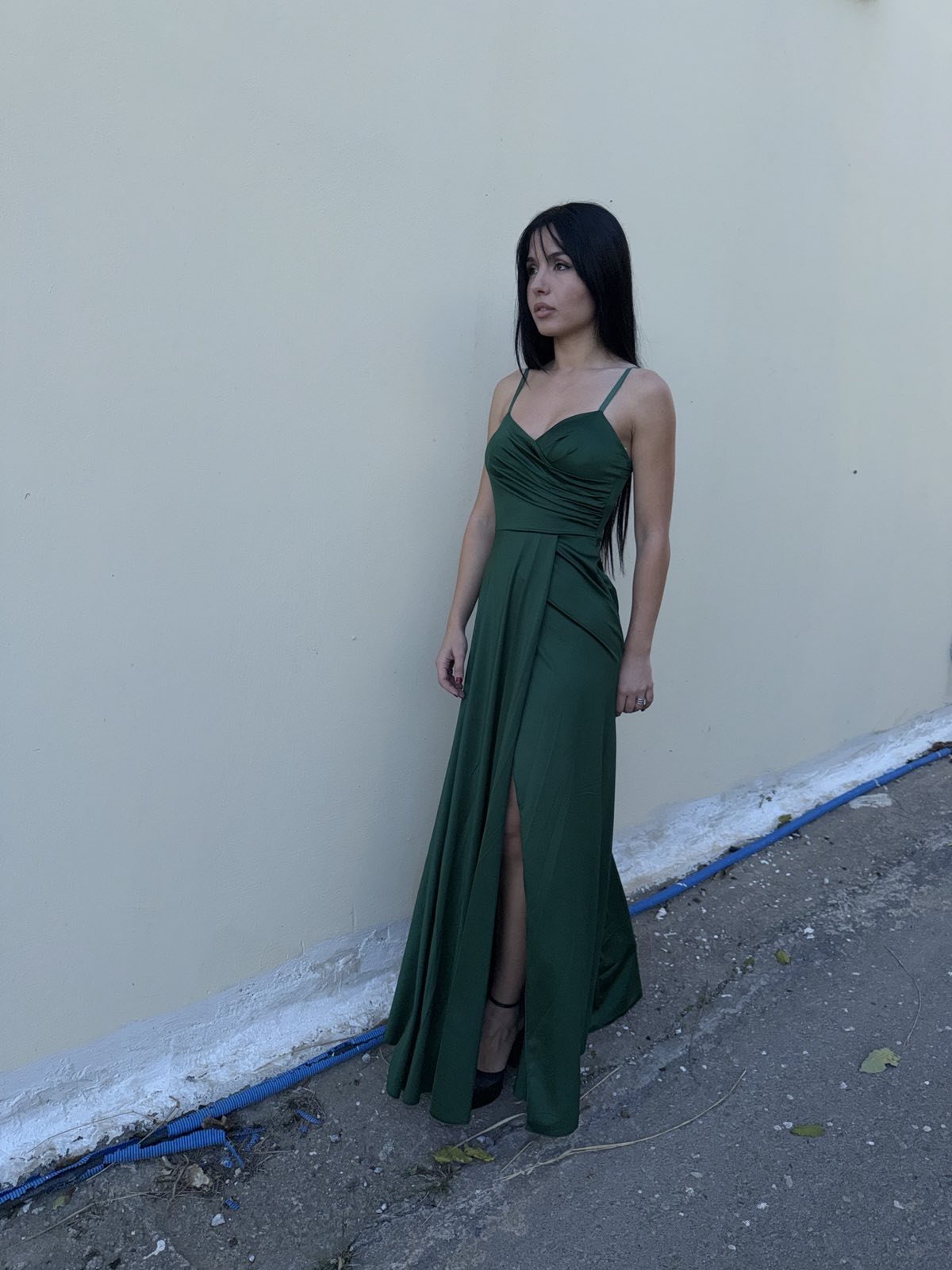 Αναδείξτε τη θηλυκότητα και το στυλ σας με αυτό το μακρύ σατέν φόρεμα σε βαθύ σμαραγδί χρώμα.