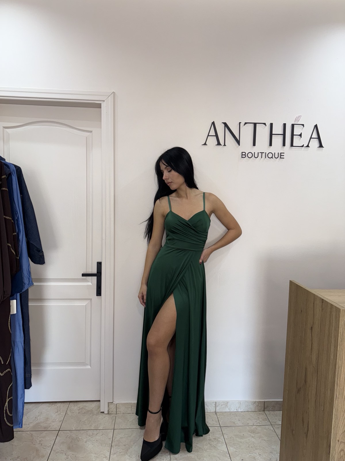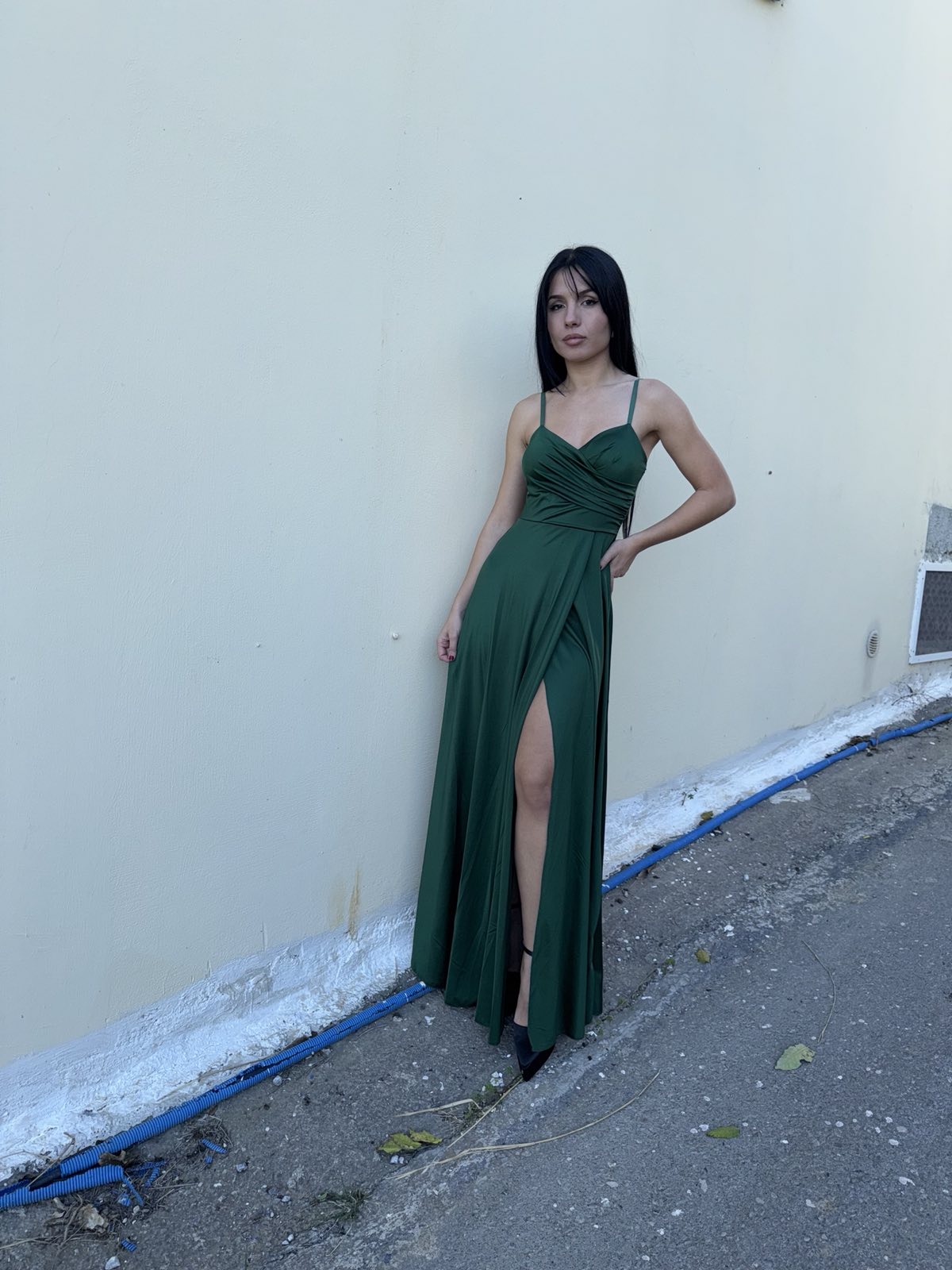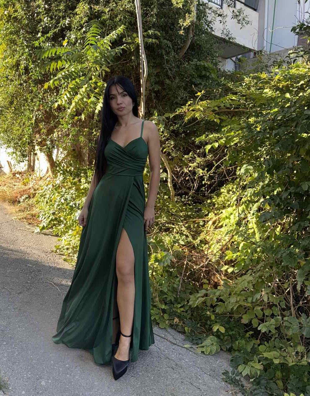 Αναδείξτε τη θηλυκότητα και το στυλ σας με αυτό το μακρύ σατέν φόρεμα σε βαθύ σμαραγδί χρώμα.