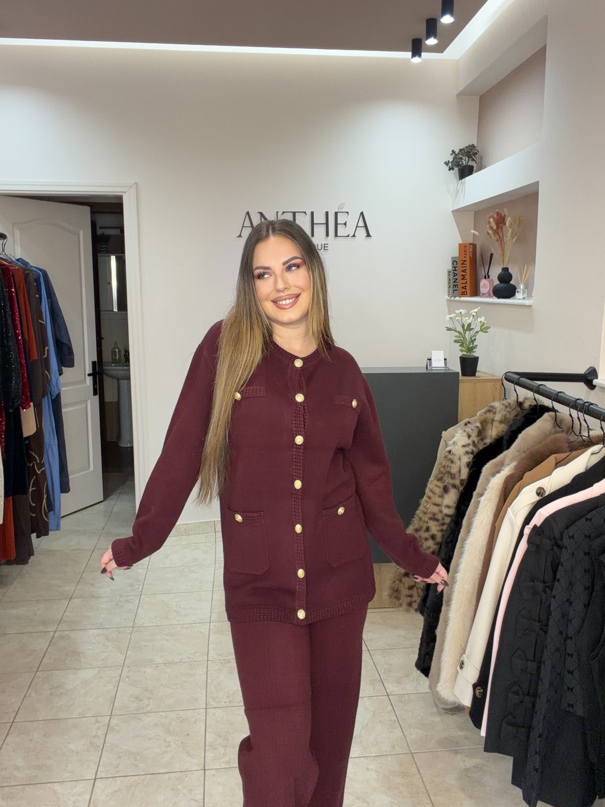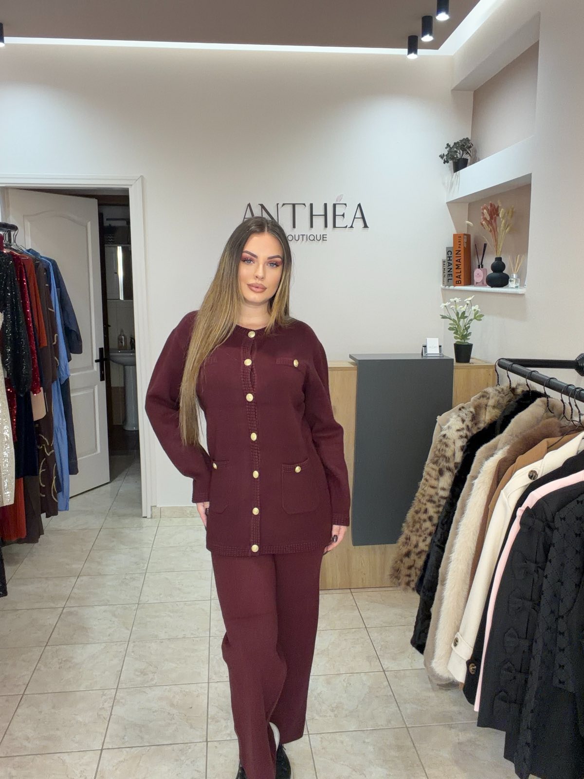Αποτελείται από μακρυμάνικο πλεκτό σακάκι με διακοσμητικά κουμπιά και ίσιο παντελόνι με ελαστική μέση για άνετη εφαρμογή.