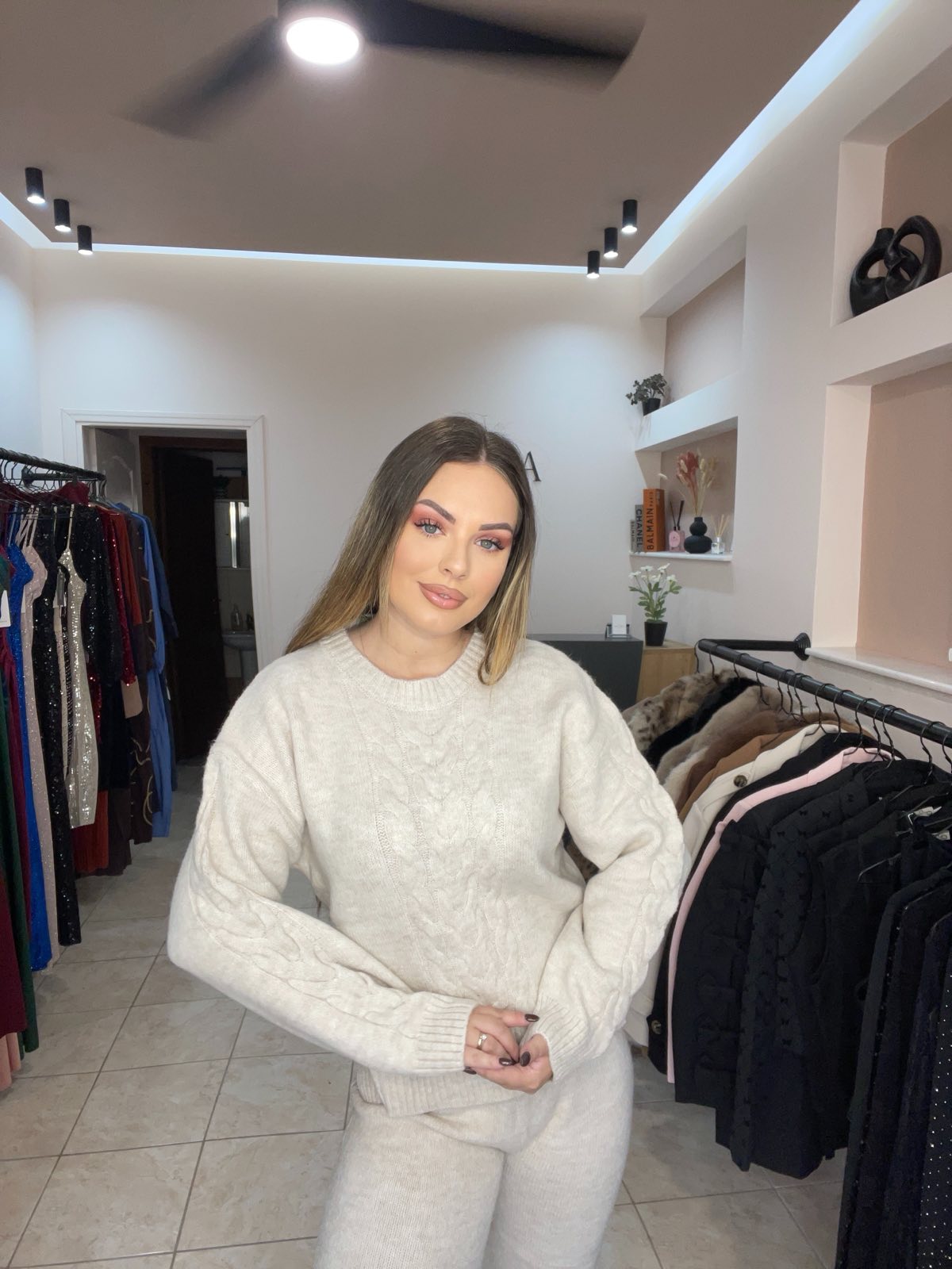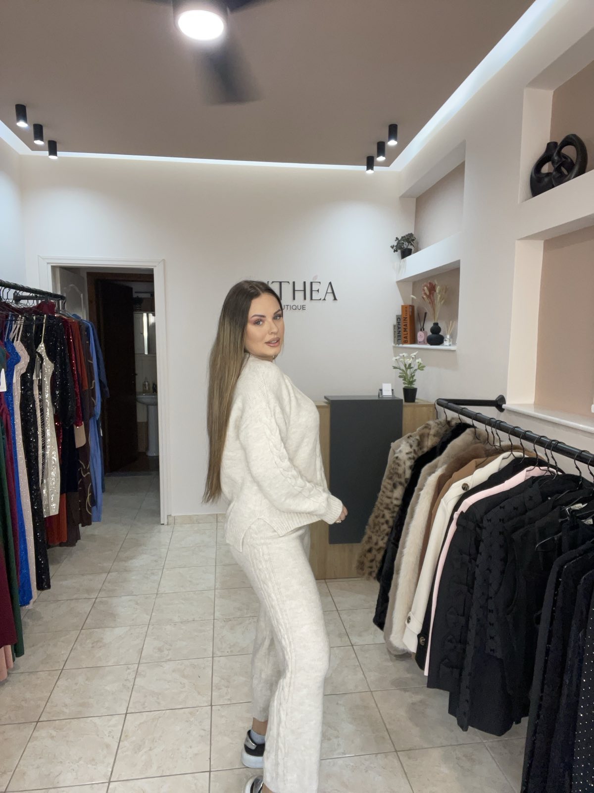 • Σύνθεση: 35% Acrylic – 65% Rayon.                              Πλεκτό σετ μπλούζα & παντελόνι σε εκρού χρώμα.