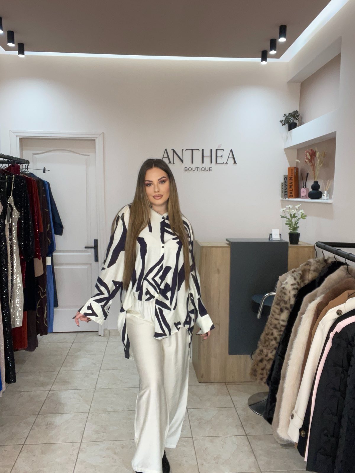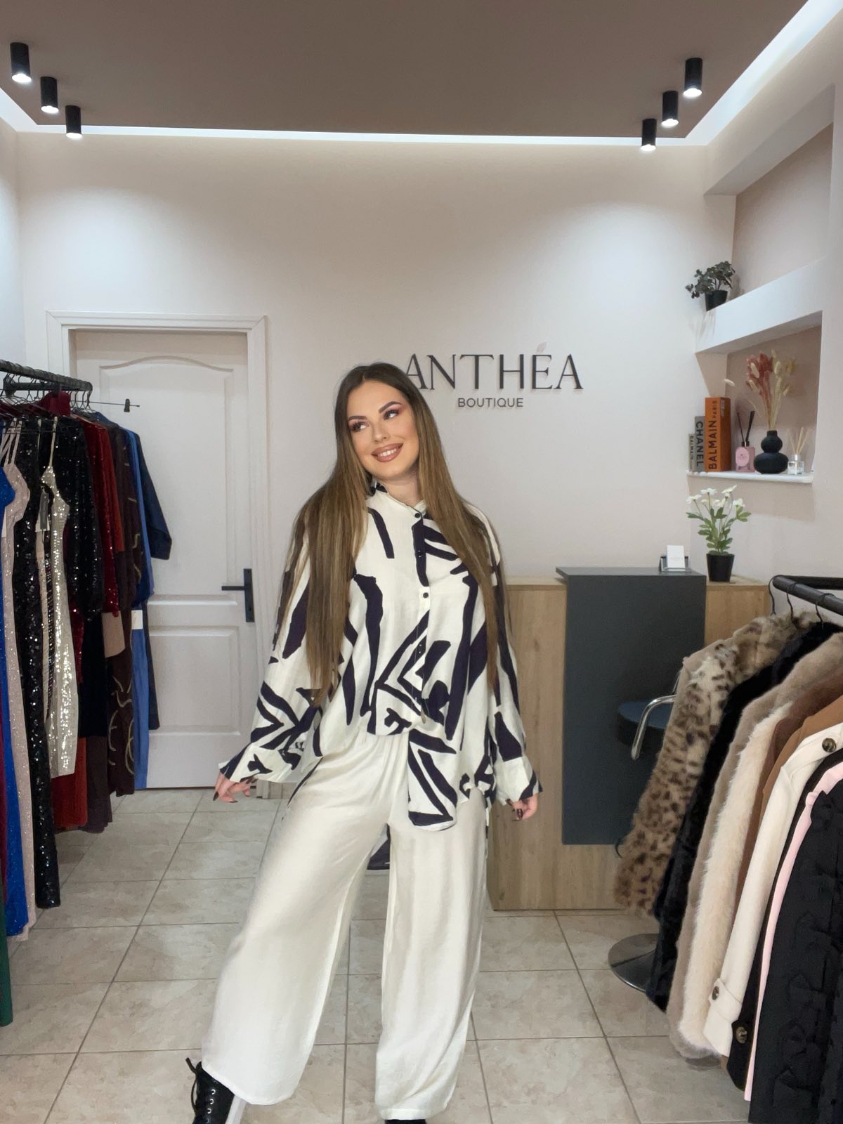 Η μπλούζα έχει μακριά μανίκια, γιακά και σχέδιο με μαύρες αφηρημένες γραμμές, ενώ το παντελόνι έχει άνετη, ίσια γραμμή και λάστιχο στη μέση για καλύτερη εφαρμογή.